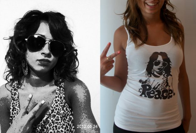 Desde París con amor, nuestra amiga Sandy, aprovechó su estancia en Sevilla para encargarnos una camiseta pacifista. Eligió uno de sus autorretratos y nos pidió que la dibujáramos con motivos Flower Power y un mensaje de paz para el mundo. ¡Parece que le encantó el resultado!